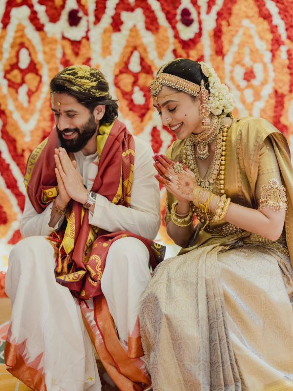 বিয়ের দিনেও সেই একই ধারা বজায় রেখে কাঞ্জিভরম শাড়ি পরেছেন শোভিতা। আর শাড়ি পরেছেন পাট দিয়ে কুঁচি করে। তেলুগু সংস্কৃতি ঠিক যে ভাবে বিয়ের দিন সাজেন কনেরা, সেভাবেই শোভিতাও হাতে পরেছেন বাজুবন্ধ, কোমরে কোমরবন্ধ এবং কপালে পরেছেন বাশিকম (হলুদ সুতোয় বাঁধা সোনার লকেট, নাগার কপালেও বাঁধা ছিল ওই হলুদ সুতোর অলঙ্কার)।
