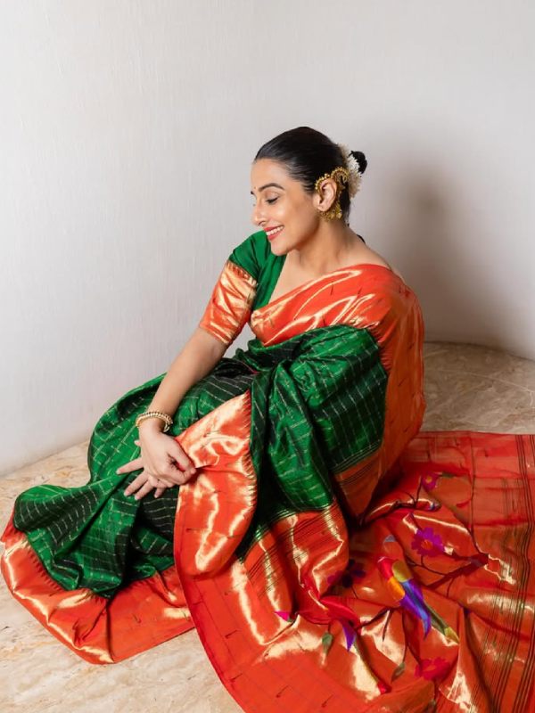 শুক্রবার চতুর্থীর সকালে বিদ্যা যে শাড়িটি পরেছেন, সেটি মহারাষ্ট্রের ঐতিহ্যবাহী পৈঠানী শাড়ি। উজ্জ্বল সবুজ রেশমের জমিতে সূক্ষ্ম সোনালি চেক নকশা সঙ্গে ঢালা টুকটুকে লাল পাড়। পৈঠানীর ঐতিহ্য মেনেই পাড়ে সোনালি সুতোর ঠাসা কাজ। একই রকমের লাল আঁচলে রঙিন সুতোর ফুল-পাতা-পাখির নকশা তোলা। বিদ্যা সেই শাড়ির সঙ্গে যে ব্লাউজ় পরেছেন, তা তৈরি করা হয়েছে শাড়ির ব্লাউজ়পিস দিয়েই। হাতে পাড় বসানো লম্বা হাতা পিঠ খোলা সাধারণ ব্লাউজ়ের নকশা। গলায় গয়না পরেননি। তবে কানে পরেছেন ভারী সোনালি ইয়ার কাফ। চুল টেনে বেঁধে খোঁপা করেছেন। চুলে দিয়েছেন জুঁই ফুলের মালা। হাতে একটি কুন্দনের বালা। সাজ বলতে এটুকুই। তবু সেই ছিমছাম সাজই আলাদা করে চোখ টানছে।