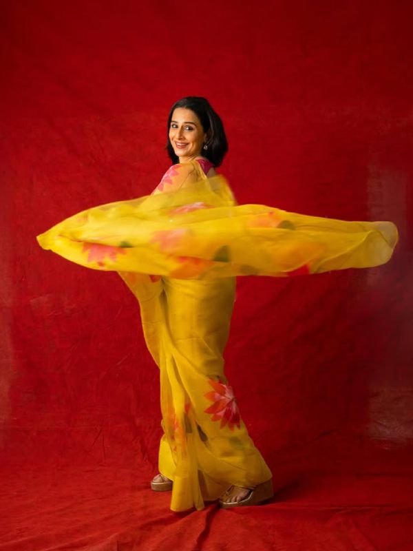 তৃতীয়ায় বিদ্যা বেছে নিয়েছিলেন হলুদ রঙের একটি অরগ্যাঞ্জা শাড়ি। দুর্গা পুজোয় ১০৮ পদ্ম দিয়ে পুজো দেওয়া হয়। বিদ্যার উজ্জ্বল হলুদ অরগ্যাঞ্জায় প্রস্ফুটিত পদ্মফুল হাতে আঁকা হয়েছে। ছড়িয়ে ছিটিয়ে রয়েছে পদ্মপাতা। আর তার উপর টলটলে জলের বিন্দু তৈরি করেছে কুন্দনের উজ্জ্বল পাথর। হলুদ শাড়িটি বিদ্যা পরেছেন গাঢ় গোলাপি রঙের ব্লাউজ় দিয়ে। কানে জলের বড় ফোঁটার মতো দেখতে কুন্দনের ড্যাঙ্গলার ইয়াররিং। পায়ে সোনালি কোলাপুরি চপ্পল। বাহুল্যহীন সাজ। তবু খোলা চুলে তাতেই অনন্যা বিদ্যা।