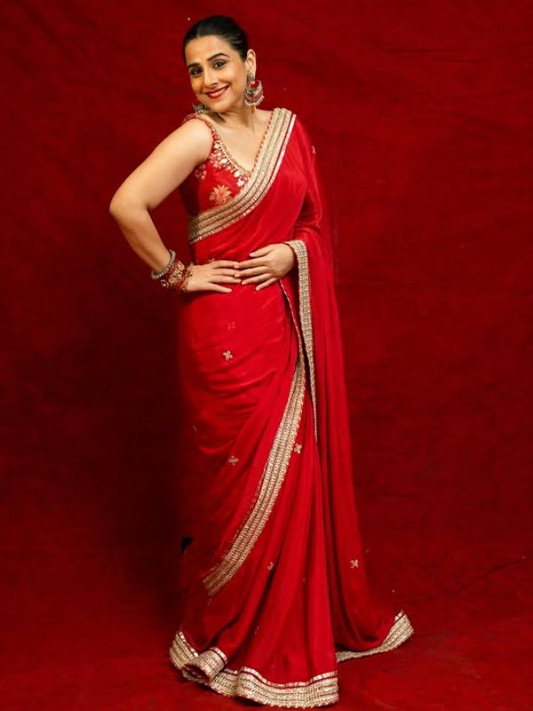 গায়ে লেপ্টে থাকা সিল্কের শাড়ি। টুকটুকে লাল সেই শাড়িতে জড়ির নকশা পাড়। সঙ্গের স্লিভলেস ব্লাউজ়টিও বেশ জমকালো। তাতে জরির নকশা তোলা বর্ডার। সরু স্ট্র্যাপ উন্মুক্ত রেখেছে কাঁধের অনেকটাই। বিদ্যা এর সঙ্গে সেজেওছেন যত্ন করে। গলায় হার পরেননি। তবে কানে দু’টি বড় চাঁদবালি কানবালা পরেছেন। সেই দুলে মোগল মিনাকারী এবং কুন্দনের কারুকাজ। নীচে ঝুলছে ছোট ছোট তারের সুতোয় গাঁথা মুক্তো। অন্য সময় হাতে বিশেষ গয়না না পরা বিদ্যা প্রতিপদে হাতে পরেছেন জমকালো নকশার কয়েক গাছা বালা। চুল বেঁধেছেন হর্সটেলের আদলে।