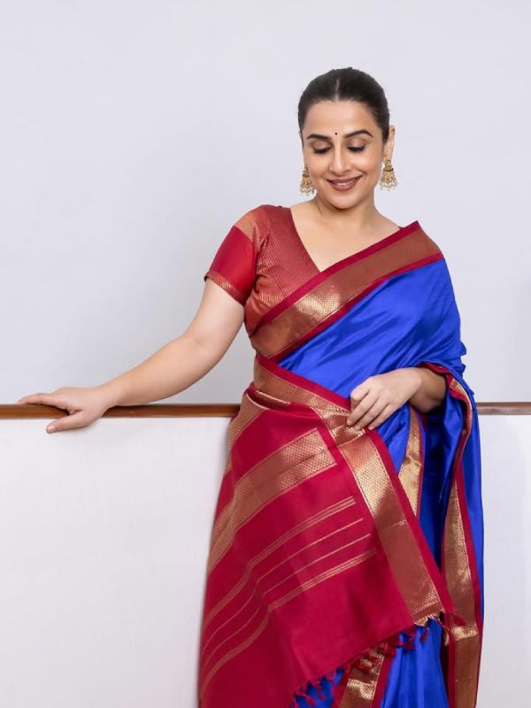 দ্বিতীয়ায় কাঞ্জিভরম। উজ্জ্বল রয়্যাল ব্লু জমি। মেরুন রঙের পাড়। তাতে বুনে দেওয়া আছে ম্যাট গোল্ড জরির আঁশ নকশা। আঁচলটিও মেরুন। বিদ্যা এই শাড়ির জন্য বেছে নিয়েছেন মেরুনের উপর আর ম্যাটগোল্ড সুতোর স্ট্রাইপ নকশার টিস্যুর ব্লাউজ়। চুলে একটি হাতখোঁপা। কপালে ছোট্ট মেরুন টিপ। হাতে-গলায় একটিও গয়না না পরে বিদ্যা কানে পরেছেন এক খানি ভারী নকশার ঝুমকো। তার নীচে ঝুলছে মুক্তোর দানা।