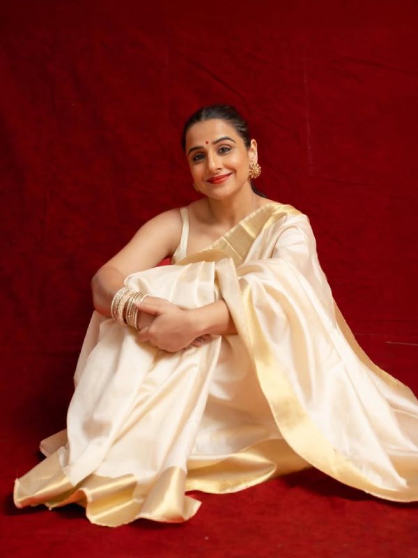 এটি ছিল বিদ্যার মহালয়ার সাজ। দুধ সাদা সিল্কের কাসাভু শাড়ি পরেছিলেন নায়িকা। তাতে সোনালি সুতোয় বোনা চওড়া পাড়। শাড়ির সঙ্গে ফিতের মতো স্ট্র্যাপ দেওয়া সাদা ব্লাউজ় পরেছেন। গলায় গয়না নেই। কানে মাঝারি মাপের দু’টি সোনার ফুল। হাতে সাদা-সোনালি রংমিলান্তির কাচের চুড়ি। এর সঙ্গে কপালে লাল টিপ আর ঠোঁটে লাল লিপস্টিক। আর চুল আলগা করে বেঁধে রেখেছিলেন বিদ্যা। সাদাতে বরাবরই ভাল লাগে তাঁকে। সে দিনও সুন্দর দেখাচ্ছিল।