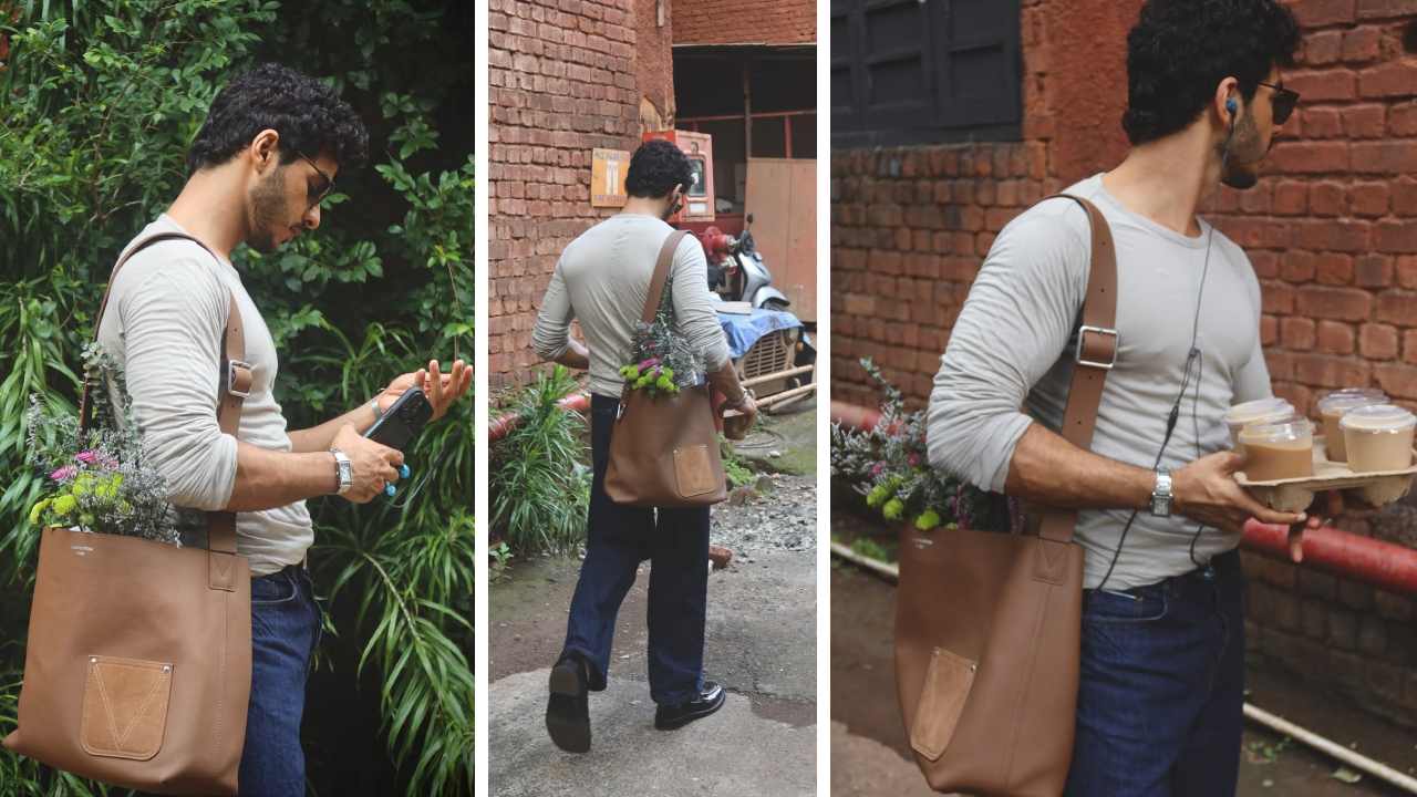 ছবিতে দেখা যাচ্ছে, ইশানের কাঁধের ঝোলা ব্যাগের ভিতর থেকে উঁকি মারছে এক গোছা ল্যাভেন্ডার ফুল। সেই ব্যাগ কাঁধে হাতে জোড়া কফির কাপ নিয়ে কানে হেডফোন গুঁজে তাড়াহীন ব্যস্ততায় বাইরে বেরিয়েছেন ইশান। যেখানেই যান, তাঁর পেশিবহুল শরীরে লেপ্টে থাকা ছাইরঙা টি শার্ট আর সামান্য ঢোলা জিন্সের কায়দাকে ছাপিয়ে ওই ব্যাগ কিছুটা বাড়তি নম্বর দেবে। কারণ, তাঁকে এক ঝলক দেখলেই বোঝা যাবে, ইনি গুছিয়ে কাজ করতে পছন্দ করেন। পছন্দ করেন পরিচ্ছন্নতা। আর ‘ঝোলা ব্যাগ কাঁধে নিলে স্মার্টনেস নষ্ট হবে’ ভেবে অনাবশ্যক আত্মবিশ্বাসের অভাবে ভোগেন না।