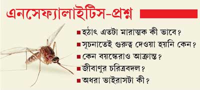 সরাসরি জবাব দেওয়ার কেউ নেই। তবে স্বাস্থ্য অধিকর্তা বিশ্বরঞ্জনবাবু আক্রান্ত এলাকায় গিয়ে পরিস্থিতির গুরুত্ব বুঝেছেন। বুঝেছেন, রোগ নির্ণয়ের পরিকাঠামো যেমন দুর্বল, তেমনই দুর্বল রোগ প্রতিরোধ ব্যবস্থা। সেই জন্যই জাপানি এনসেফ্যালাইটিস ছাড়াও এনসেফ্যালাইটিসের উপসর্গ-সহ আর কোন রোগ হানা দিয়েছে, তা জানতে ব্যর্থ হয়েছে স্বাস্থ্য দফতর। ব্যাপক সংক্রমণের পিছনে অন্য জীবাণু আছে কি না, তা জানা যায়নি এখনও।