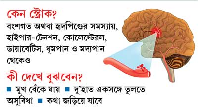 অ্যাপোলো-র স্ট্রোক-বিশেষজ্ঞ চিকিৎসক জয়ন্ত রায় জানাচ্ছেন, স্ট্রোক হওয়ার পরে মস্তিষ্কের যে ভাগে রক্ত পৌঁছোয় না, সেখানে অক্সিজেনের অভাবে প্রতি সেকেন্ডে ৩২ হাজার কোষ মারা যেতে শুরু করে। ফলে, যত তাড়াতাড়ি রোগীকে হাসপাতালে নিয়ে আসা যায়, ততই মঙ্গল। জয়ন্তর কথায়, ‘‘সাড়ে চার ঘণ্টার পরে আনলে এখন ক্যাথ-ল্যাবে স্টেন্ট বসিয়ে মস্তিষ্কে রক্ত চলাচল স্বাভাবিক করা যাচ্ছে। তবে যে স্ট্রোক রক্ত জমাট বাঁধার কারণে হয়, কেবল সে সব ক্ষেত্রেই তা কাজ করবে। রক্তক্ষরণের ফলে যে স্ট্রোক, সে ক্ষেত্রে কাজ করবে না। দুই, আট ঘণ্টার মধ্যে স্টেন্ট বসালে তবেই কাজ করা সম্ভব। তার চেয়েও দেরি হলে মুশকিল।’’