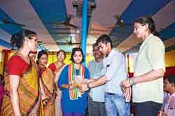 সংবর্ধনা তিথিকে (মাঝে)।—নিজস্ব চিত্র।