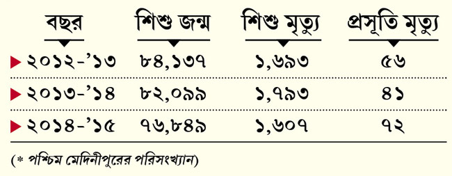 জেলার স্বাস্থ্য- কর্তাদের ধারণা ছিল, এই ইউনিটগুলো চালু হলে শিশু মৃত্যুর ঘটনা কমবে। ২৪ ঘণ্টাই সঙ্কটজনক শিশুদের বিশেষ পর্যবেক্ষণে রাখা যাবে। যদিও তারপরেও জেলায় শিশু মৃত্যুর হারের বিশেষ হেরফের হয়নি। মা ও নবজাতকদের স্বাস্থ্য রক্ষায় বিশেষ টাস্ক ফোর্স গঠন হয়েছে। একের পর এক ইউনিট গড়ে তোলা হয়েছে। গত তিন বছরের পরিসংখ্যান বলছে, পশ্চিম মেদিনীপুরে বছরে গড়ে ১,৬৯৭ জন শিশুর মৃত্যু হয়। ২০১৩-১৪ অর্থবর্ষে জেলায় মোট ১ হাজার সাতশো ৯৩ জন শিশুর মৃত্যু হয়। ২০১৪-১৫ সালে মৃত শিশুর সংখ্যা ১ হাজার ছ’শো সাত। সংখ্যা সামান্য কমলে পরিস্থিতির বিশেষ উন্নতি হয়নি।