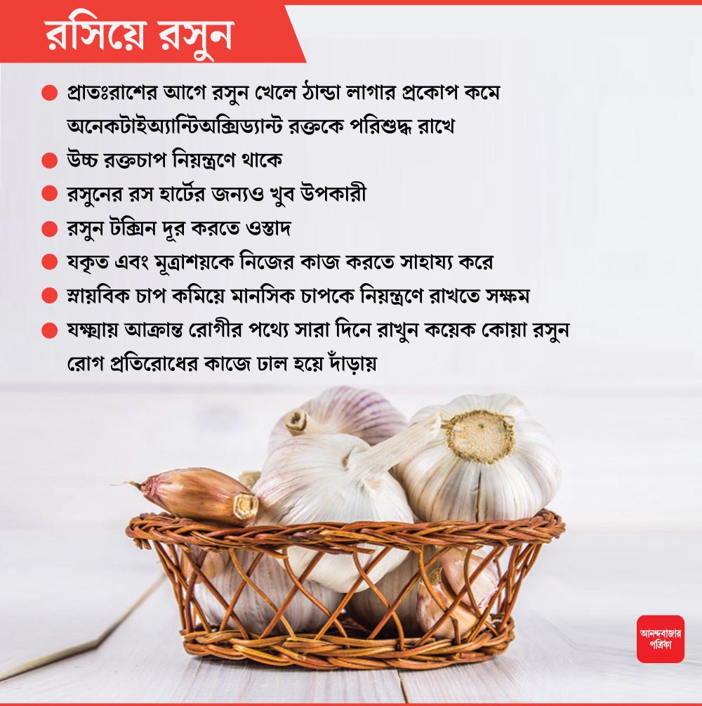 অ্যান্টিঅক্সিড্যান্টে ঠাসা এই সব্জি রক্তকে পরিশুদ্ধ রাখে। রক্তে উপস্থিত শর্করার পরিমাণ নিয়ন্ত্রণেও বিশেষ ভূমিকা পালন করে রসুন। শরীরকে ডিটক্সিফাই করার কাজে ওস্তাদ রসুন। সকালে খালিপেটে রসুনের কোয়া খেলে সারা রাত ধরে চলা বিপাকক্রিয়ার কাজ যেমন উন্নত হয়, তেমনই শরীরের দূষিত টক্সিনও মূত্রের মাধ্যমে বেরিয়ে যেতে পারে। ক্রনিক ঠান্ডা লাগার অসুখ যাঁদের রয়েছে, খালিপেটে এক কোয়া রসুন তাঁদের জন্য খুব উপকারী। একটানা দু’সপ্তাহ সকালে রসুন খেলে ঠান্ডা লাগার প্রবণতা অনেকটা কমে। হার্টের রোগীদের ক্ষেত্রে রসুন বিশেষ কার্যকর। হৃদস্পন্দনের হার নিয়ন্ত্রণ করতে ও হৃদপেশীর দেওয়ালে চাপ কমাতে কাজে আসে এই সব্জি।