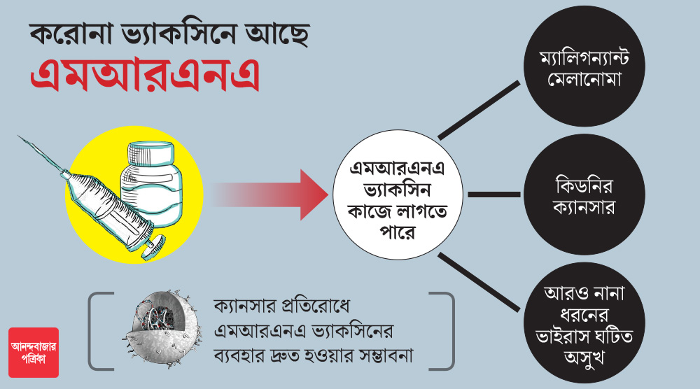 ক্যানসারের বিরুদ্ধে এমআরএনএ টিকার প্রয়োগের পরিকল্পনা আজকের নয়। এমনটাই বলছেন মেডিসিন বিশেষজ্ঞ অরিজিৎ রায়চৌধুরী। তাঁর কথায়: ‘‘গত ১০-১২ বছর ধরেই ক্যানসারের বিরুদ্ধে লড়াই করার জন্য এমআরএনএ ভ্যাকসিনের প্রয়োগ নিয়ে কাজ করছেন বিশেষজ্ঞরা। এত দিন গবেষণার কাজটা যে গতিতে চলছিল, কোভিডের কারণে সেই গতি অনেকটা বেড়ে গিয়েছে।’’ ক্যানসার রোগ বিশেষজ্ঞ কৌশিক চট্টোপাধ্যায়েরও একই মত, ‘‘এমআরএনএ নিয়ে কাজ চলছিলই। এক দিন না এক দিন বিশেষ কিছু ক্যানসারের চিকিৎসায় এর প্রয়োগ শুরু হতই। সেটাই বেশ খানিকটা ত্বরাণ্বিত হল। অচিরেই ম্যালিগন্যান্ট মেলানোমা, কিডনির ক্যানসার-সহ আরও বেশ কয়েকটি ক্যানসারের ক্ষেত্রে এর প্রয়োগ শুরু হতেই পারে।’’