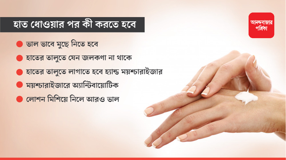 চিকিৎসকদের বক্তব্য, হাত ধোওয়ার পরেই তা খুব ভাল ভাবে মুছে নিতে হবে। যাতে জলকণা থেকে না যায়। তার পর হাতের তালুতে ভাল হ্যান্ড ময়শ্চারাইজার বা অ্যান্টিবায়োটিক লোশন মেশানো ময়শ্চারাইজার মেখে নিতে হবে। যাতে হাতের তালুকে রক্ষা করা যায়। যদি গ্লাভস পরি, তা হলে তার আগে হ্যান্ড ময়শ্চারাইজার বা অ্যান্টিবায়োটিক লোশন মেশানো ময়শ্চারাইজার মেখে নেওয়াটা খুব প্রয়োজন। না হলে গ্লাভসের মধ্যে হাতের তালু ঘেমে গিয়ে হিতে বিপরীত হতে পারে।