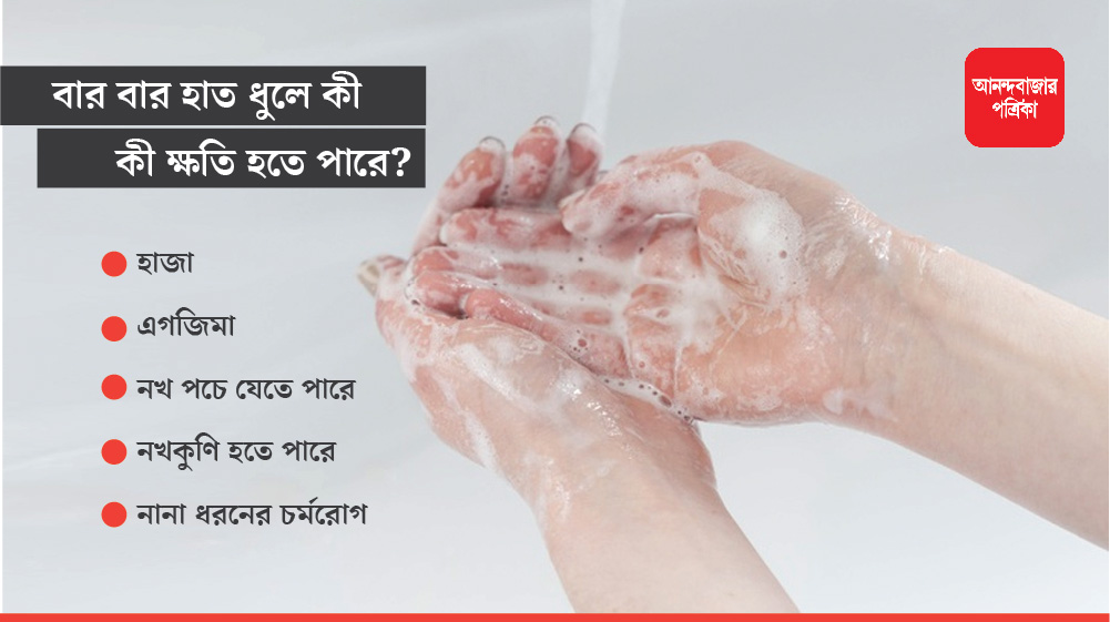 তাঁদের বক্তব্য, হাতে জল থেকে গেলে হাজা হতে পারে। হতে পারে এগজিমা-সহ নানা ধরনের চর্মরোগ। ঘা হতে পারে হাতের তালুতে। তার ফলে, ডায়াবিটিস বা কিডনির অসুখে দীর্ঘ দিন ধরে ভুগছেন যাঁরা, তাঁদের আরও নানা রকমের বাড়তি অসুখে পড়তে হতে পারে বলেও মনে করছেন তাঁরা। তাই হাত ধুয়ে খুব ভাল ভাবে মুছে ফেলাটা খুব জরুরি।
