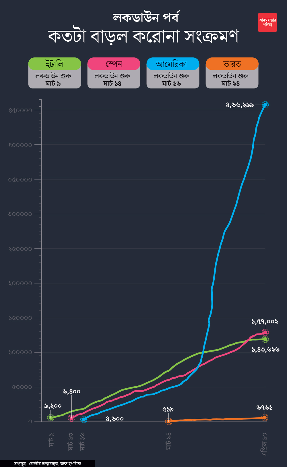 উপরের গ্রাফে দেওয়া তথ্যগুলোতে আর একটি গুরুত্বপূর্ণ দিক রয়েছে। ভারতে যখন লকডাউন শুরু হয়েছে তখন আক্রান্তের সংখ্যা ৫০০-র মতো। কিন্তু আমেরিকায় লকডাউন শুরু হয়েছিল সাড়ে ৪ হাজারের বেশি মানুষের করোনা সংক্রমণ ধরা পড়ার পর। স্পেন-ইতালির ক্ষেত্রে সংখ্যাটা আরও বেশি। অনেকেরই মতে— ওরা দেরি করে ফেলেছে। সে দিক থেকে ভারতের সামনে চিন-ইরান-ইতালি-স্পেন-আমেরিকা ইত্যাদি দেশগুলোতে সংক্রমণ দ্রুত ছড়িয়ে পড়ার ছবিটা ছিল। এখানে প্রথমে পশ্চিমবঙ্গ-সহ কয়েকটি রাজ্যে এবং পরবর্তীতে সারা দেশে লকডাউন কার্যকর হয়েছে তুলনামূলক ভাবে আগে। এটা সম্ভবত একটা বড় আশার দিক। যদিও শেষ কথা বলার সময় এখনও আসেনি।