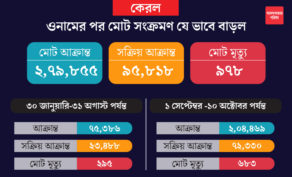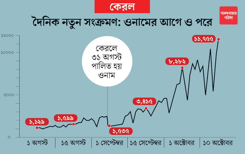 চিকিৎসক কৌশিক লাহিড়ি বলেন, ‘‘ওনামের থেকে শিক্ষা নিতে হবে আমাদের। আমরা শেষ সীমায় পৌঁছে গিয়েছি। হাসপাতালে শয্যা সংখ্যাও সীমিত। চিকিৎসকদের পরিশ্রম করারও ক্ষমতা কমছে। কেউ কোনও ছুটি পাননি। এত বড় উৎসবের পরে সংক্রমণের সুনামি এলে তা সামলানো যাবে না। কেরলে উৎসবের পরে বহু গুণ বেড়ে গিয়েছে সংক্রমণের পরিমাণ। দৈনিক আক্রান্তের সংখ্যা ১১০০০ পেরিয়ে গিয়েছেসে রাজ্যে।’’ এদিকে স্বাস্থ্য দফতর প্রকাশিত শনিবারের বুলেটিন অনুযায়ী, গত ২৪ ঘণ্টায় আমাদের রাজ্যে করোনায় সংক্রমিত হয়েছেন তিন হাজার ৫৯১ জন। দৈনিক পরিসংখ্যানের নিরিখে যা এখনও সর্বোচ্চ। ফলে ভয়াবহ পরিস্থিতি আসতে চলেছে। জনস্রোতের মধ্যে কেউ যাবেন না। চিকিৎসক হিসেবে তিনি শঙ্কিত।
