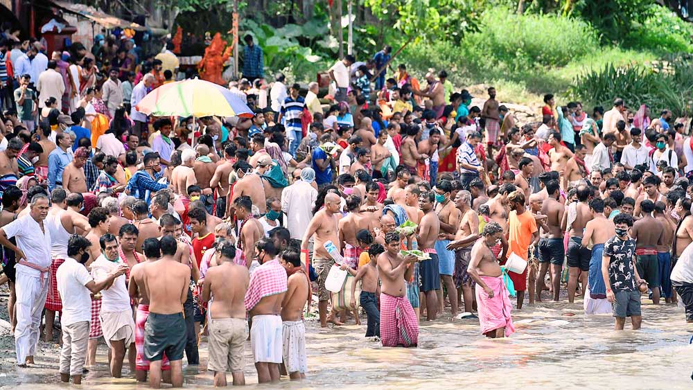 নেই মাস্ক, মানা হয়নি দূরত্ব-বিধিও। মহালয়ায়, বাবুঘাটে। ছবি: সুদীপ্ত ভৌমিক