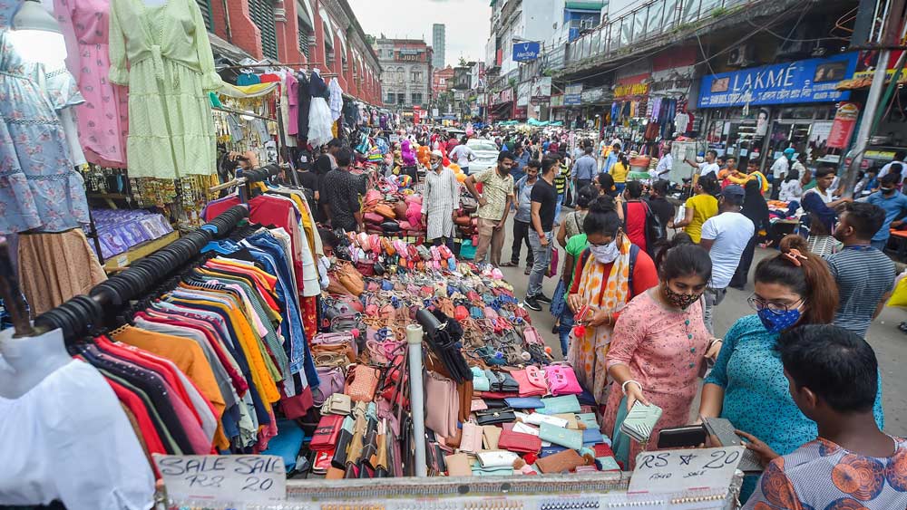 অতিমারি পরিস্থিতিতেও পুজো শপিং চলছে। সামাজিক দূরত্বের বালাই নেই। ছবি: পিটিআই