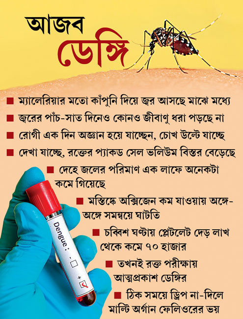 তাই তিন জনকেই ডাক্তারেরা প্রথমে নিদান দিয়েছিলেন, চিন্তার কারণ নেই। এখন ওঁদের অবস্থা দেখে পরজীবী-বিশেষজ্ঞদের অনেকে হতভম্ব। এক জনের বিশ্লেষণ, ‘‘ডেঙ্গির ভাইরাস রক্তের ভিতরে ঘাপটি মেরে ছিল। পরীক্ষার জালে ধরা তো দেয়ইনি, উল্টে নিঃশব্দে বংশবিস্তার করে গিয়েছে। মওকা বুঝে হঠাৎ টেনে নামিয়ে দিয়েছে প্লেটলেটের সংখ্যা। তাতেই শক সিনড্রোম।