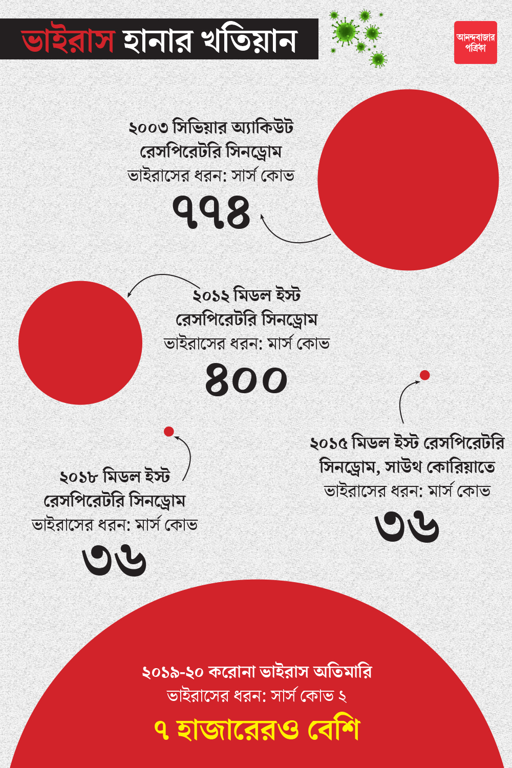 অর্থাৎ, বিপদের নিরিখে করোনাভাইরাসের নবতম রূপ কোভিড-১৯ যে সবাইকে ছাড়িয়ে গিয়েছে, তা আর বলার অপেক্ষা রাখে না। বিশেষজ্ঞ চিকিৎসক সুমিত সেনগুপ্তের মতে, “করোনাকে হালকা ভাবে নেওয়ার কোনও অবকাশ নেই। বরং তাকে খুবই গুরুত্ব দিতে হবে। প্রতিরোধের যত রকম উপায় আছে, মেনে চলতে হবে সব। কারণ মারাত্মক ছোঁয়াচে এই অসুখটির চিকিৎসা এখনও চলছে মোটামুটি উপসর্গের উপর ভিত্তি করে। অতএব সতর্ক হয়ে চলাই এখন বুদ্ধিমানের কাজ।”