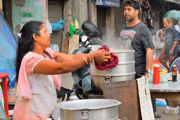 কলকাতার রাস্তায় মোমো বিক্রির এ দৃশ্য খুব চেনা। ছবি: শাটারস্টক।