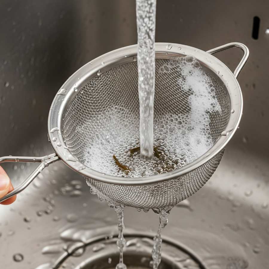 ছাঁকনি স্টিলের হল ফুটন্ত জলে মিনিটখানেক রেখে দিন। এতে পরিষ্কার হবে এবং জীবাণুমক্ত হবে ছাঁকনিটি।