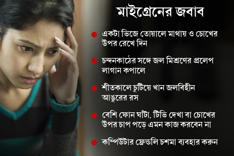 মাইগ্রেনের ব্যথা সারাতে শীতকালে চুটিয়ে খান আঙুরের রস। তবে জল মেশাবেন না এতে। অল্প ব্যথা হলে অন্ধকার ঘরে ঘুমনোর চেষ্টা করুন। আলোর প্রভাবে এই ব্যথা বাড়ে। মাইগ্রেন থাকলে সারা বছরই খুব বেশি ফোন ঘাঁটা, টিভি দেখা বা চোখের উপর চাপ পড়ে এমন কাজ করবেন না। কম্পিউটারের সামনে বসে দীর্ঘ ক্ষণ কাজ করার অভ্যাস থাকলে মাঝে মাঝেই উঠুন। চোখে জল দিন। ব্যবহার করুন এমন চশমা যাতে চোখের উপর চাপ না পড়ে।