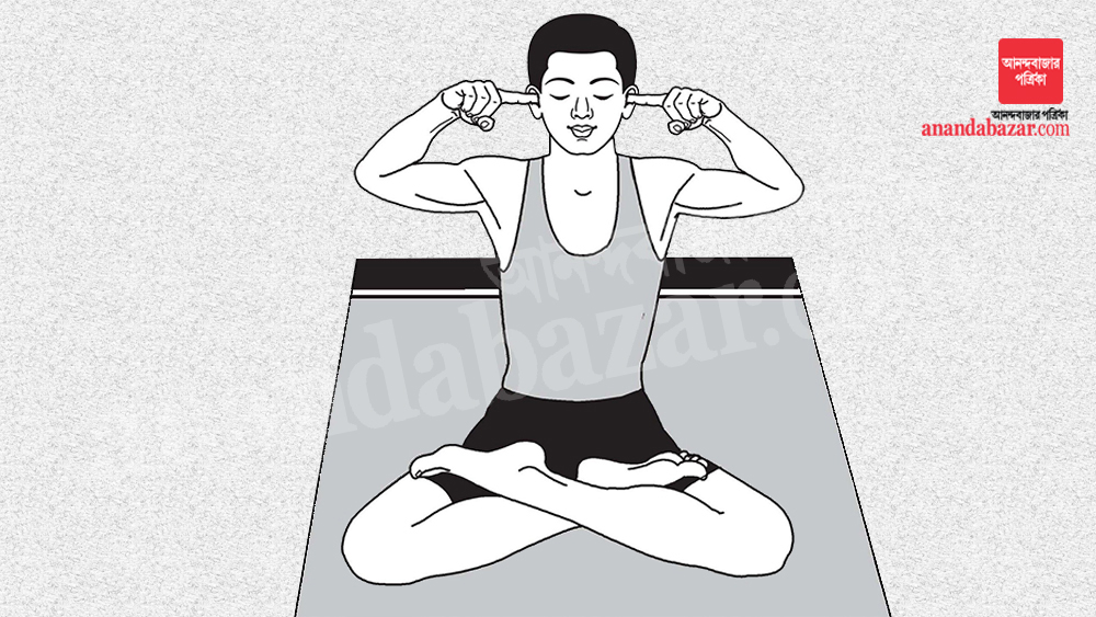 পদ্ধতি: আরামদায়ক ভাবে পদ্মাসন বা সিদ্ধাসনে বসুন। হাত দু’টিকে চিন বা জ্ঞান মুদ্রায় (বুড়ো আঙুল ও তর্জনী জুড়ে হাতের তালুকে আকাশের দিকে রাখা হল জ্ঞান মুদ্রা, ওই ভাবেই নীচের দিকে রাখলে তা হল চিন মুদ্রা) দুই হাঁটুর উপর রাখুন। সোজা হয়ে বসে চোখ বন্ধ করে আরামদায়ক অবস্থায় রাখুন পুরো শরীরকে। এই প্রাণায়ামের সময় দুই ঠোঁট জোড়া অবস্থায় রাখলেও মুখের ভিতর দাঁতের দুই পাটির মাঝে সামান্য ফাঁক রাখতে হবে। এ বার ধীরে ধীরে দুই হাতের কনুই ভাঁজ করে তাদের দুই কানের কানের গহ্বরের কাছে নিয়ে যান। এ বার তর্জনী ও মধ্যমা দিয়ে কানের গহ্বর বন্ধ করে দিন বা কর্ণগহ্বরের পাশের টুপির মতো মাংসল অংশ চেপে কান বন্ধ ধরুন। তবে কোনও ভাবেই কানের ভিতরে কোনও আঙুল প্রবেশ করানো যাবে না।