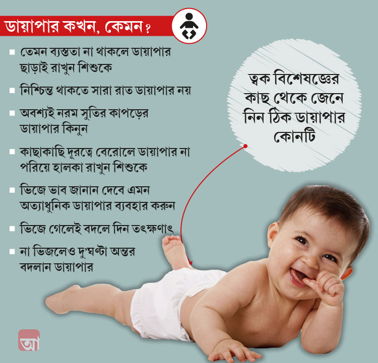 সাধারণত, বেশির ভাগ অভিভাবক মনে করেন, শিশুকে প্যান্টের ভিতরে ডায়াপার পরিয়ে রাখার মানেই অনেকটা নিশ্চিন্ত থাকা। তাই বাইরে বেরিয়ে বা সারা দিন পরিশ্রমের পর রাতে একটু নিশ্চিন্তে বিশ্রামের কারণে অনেক মা-বাবাই প্রায় তিন বছর বয়স পর্যন্ত সন্তানকে ডায়াপার পরিয়ে রাখেন। কিন্তু এটি ব্যবহারের সময়, নিয়ম ও পদ্ধতি না জানার কারণে শিশুর অস্বস্তি তো হয়ই, তা ছাড়া তার ত্বকেও নানা প্রদাহ তৈরি হয়, এমনকি শ্লেষ্মাজনিত অসুখেরও শিকার হয় শিশু।