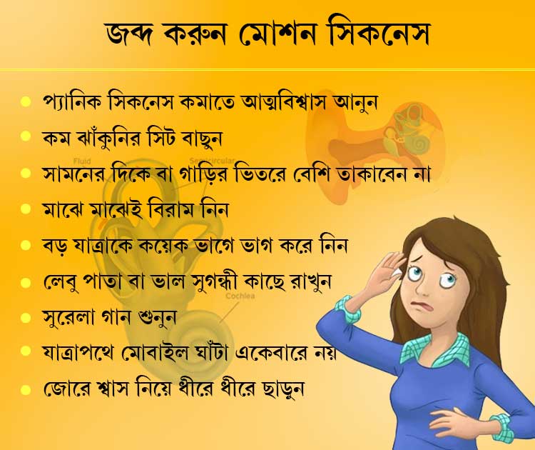 গাড়িতে বসে মোবাইল ঘাঁটবেন না। মোবাইলের রশ্মি থেকেও বমি ভাব বাড়ে। কম ঝাঁকুনির সিট বাছুন। তাতে সমস্যা অনেকটা কমবে। শ্বাস-প্রশ্বাসের স্বাভাবিক ব্যায়ামগুলো রপ্ত করতে পারলে ভাল হয়। জোর শ্বাস নিয়ে খুব ধীরে ধীরে ছাড়ুন। মন অন্য দিকে রাখতে মন ভাল রাখার সুরেলা গান শুনুন। তবে সে গানে খুব বেশি বাজনার প্রভাব থাকলে মস্তিষ্ক বিরূপ প্রতিক্রিয়া দেখাতে পারে। তাই শান্ত, সুরেলা গান শুনুন।
