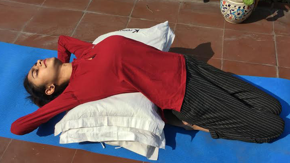 সুপ্ত বজ্রাসন: দুটো বালিশ পিঠের নীচে রাখুন। বজ্রাসন অতি পরিচিত ভঙ্গী । হাঁটু মুড়ে বসে বালিশে ভর রেখে ছবির মতো শারীর পিছনে হেলিয়ে, মাথা মাটিতে রাখুন। শ্বাস নেওয়া ছাড়া স্বাভাবিক রাখুন । ১০-৩০ সেকেন্ড থাকার পর বিশ্রাম। পর পর তিন বার করুন ।
