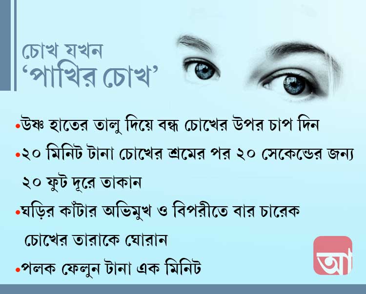 হাতের তালু দু’টি একসঙ্গে এনে একে অপরের সঙ্গে ঘষুন। এতে হালকা একটা উত্তাপ সৃষ্টি হয়। এ বার সেই উত্তপ্ত তালু চোখ বন্ধ করে চোখের পাতার উপর ধরে থাকুন। এই অবস্থায় আলতো চাপ দিন চোখে। দিনের মধ্যে বার কয়েক এমন করলে চোখ তার প্রয়োজনীয়তা উষ্ণতা পাবে। অতিরিক্ত সক্রিয় থাকার কারণে যে ক্লান্তি তৈরি হয়, তা-ও কাটবে। একটানা কম্পিউটার বা মোবাইল ব্যবহার করলে মাঝে মাঝেই চোখের পলক ফেলুন। এমনিতে চোখের তেমন কোনও সমস্যা না থাকলে স্বাভাবিক শারীরবৃত্তীয় প্রক্রিয়াতেই ঘন ঘন চোখের পলক পড়ে। যদি একটানা চোখের পরিশ্রমের কাজ করেন, তবে এই পলক ফেলার কাজটি নিজেও চেষ্টা করে করুন। এক মিনিট ঘন ঘন চোখের পাতা ফেলা একটি ব্যায়ামের মতো কাজ করে। এতে চোখ বেশি ক্ষণ শুষ্ক থাকে না।