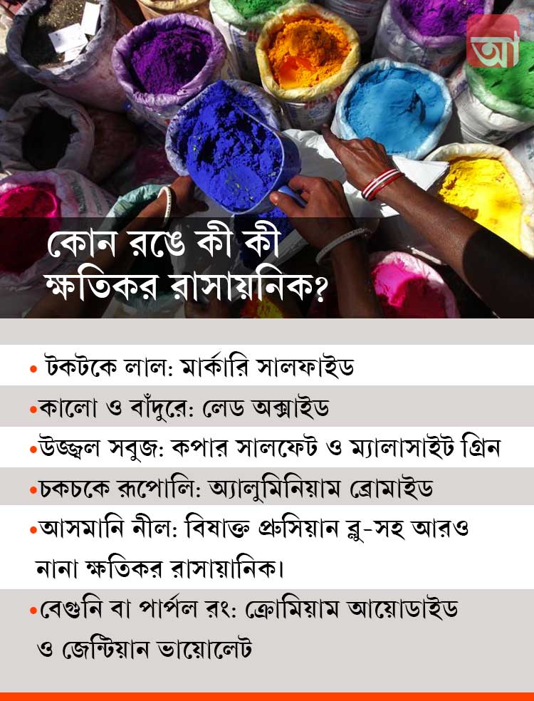 ‘‘আবিরই হোক অথবা নানা উজ্জ্বল রং— এদের মূল উপাদান নানা ক্ষতিকর রাসায়ানিক। এই সব কেমিক্যালের প্রভাবে র্যাশ, এগজিমা আর চুলকানি ছাড়াও কারও কারও আবার শ্বেতির মতো দুধসাদা দাগ হয়ে যায়। বাড়ে অ্যালার্জিজনিত অ্যাজমার অ্যাটাক’’, বলছিলেন ত্বক রোগ বিশেষজ্ঞ ডা সন্দীপন ধর। বাচ্চাদের তো বটেই, বড়দের মধ্যেও রং থেকে কন্ট্যাক্ট ডার্মাটাইটিস থেকে শুরু করে, নানা ত্বকের সমস্যার ঝুঁকি বাড়ে।