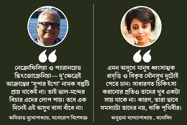 মনোরোগ বিশেষজ্ঞ অমিতাভ মুখোপাধ্যায় বলেন,‘‘এই ধরনের অপরাধীদের ক্ষেত্রে সাইকোলজিক্যাল যে সমস্যাই থাক না কেন, তাতে কিন্তু এদের অপরাধপ্রবণতা বা অপরাধমনস্কতাকে মেনে নেওয়া যায় না। অসুখ সেখানে কোনও প্রলেপ হতে পারে না। তবে হ্যাঁ, নেক্রোফিলিয়া ও প্যারানয়েড স্কিৎজোফ্রেনিয়া— দু’ক্ষেত্রেই আক্রান্তের ‘সুপার ইগো’ নামক বস্তুটি প্রায় থাকেই না। তাই ভাল-মন্দের বিচার এদের লোপ পায়। তবে এক দিনেই এই অসুখ বাসা বাঁধে না। এমন কোনও অসুখের নেপথ্যে থাকে আক্রান্তের বেড়ে ওঠা, শৈশব বা জীবনের কোনও এক পর্যায়ে ঘটে যাওয়া কোনও বিশেষ ঘটনা। তার জীবনযাত্রা কেমন তা-ও জানতে হবে এই রোগের উৎসে পৌঁছতে চাইলে।’’