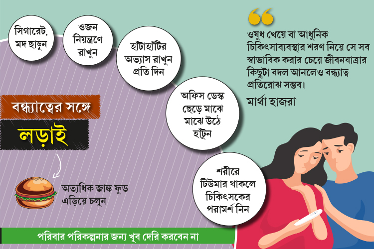 ‘‘বন্ধ্যাত্বের সমস্যা নিয়ে আগে মানুষের মধ্যে নানা ভুল ধারণা ছিল। এখনও শিক্ষার আলো যেখানে কম, সেখানে সমস্যাটা রয়ে গিয়েছে। মানুষ ব্যক্তিগত স্তরে কিছুটা সচেতন হয়েছে। তবে প্রত্যন্ত গ্রামাঞ্চলে এখনও এ নিয়ে কিছুটা অজ্ঞানতা রয়েই গিয়েছে। বন্ধ্যাত্ব বেড়ে যাওয়ার অনেকগুলো কারণের মধ্যে মূলত জীবনযাপনের কায়দাকানুন অন্যতম। কারও কারও ক্ষেত্রে ওষুধ খেয়ে বা আধুনিক চিকিৎসাব্যবস্থার শরণ নিয়ে সে সব স্বাভাবিক করার চেয়ে জীবনযাত্রার কিছুটা বদল আনলেই তা অনেকটা সমাধান হয়ে যায়। আর এই বদল আনা উচিত সন্তানধারণের অনেক আগে থেকেই।’’—জানালেন স্ত্রীরোগ বিশেষজ্ঞ মার্থা হাজরা।