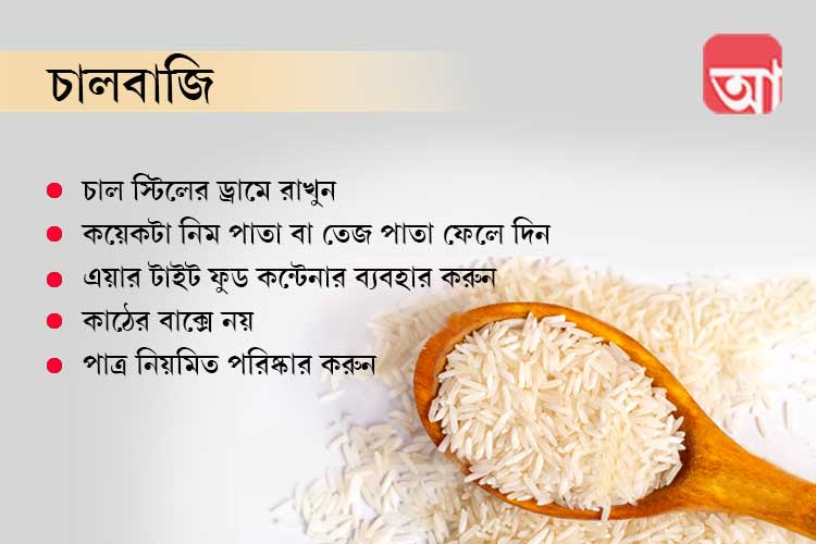 চাল কখনও কাঠের বাক্সে রাখবেন না। কাঠে পোকা বৃদ্ধি পাওয়ার সম্ভাবনা থাকে। নিয়মিত চালের চালে পোকা ধরলে তা ফ্রিজে ঢুকিয়ে রাখুন। ফ্রিজের ঠান্ডায় পোকা মারা যায়।