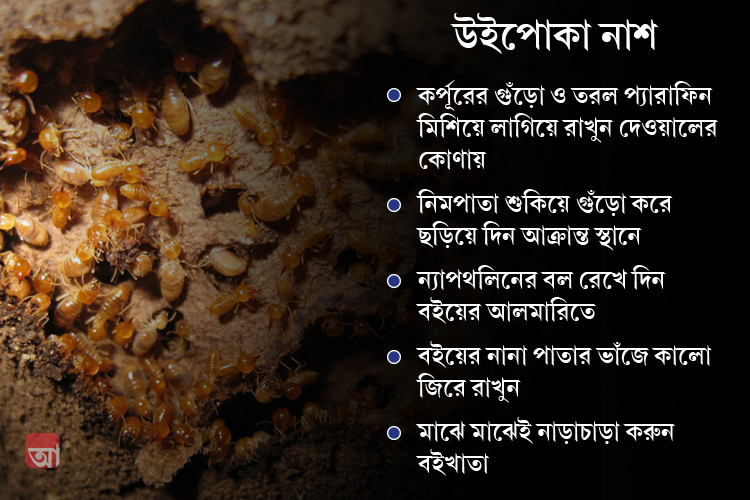যে দেওয়ালে উইপোকার আক্রমণ বেশি, সেখানে কর্পূরের গুঁড়ো ও তরল প্যারাফিন মিশিয়ে একটি দ্রবণ তৈরি করুন। দিন চার-পাঁচ অন্তর তা লাগিয়ে রাখুন দেওয়ালের কোণায়। নিমপাতা শুকিয়ে গুঁড়ো করে নিন। বইয়ের আলমারির তাকে, বা কাঠের আসবাবের কোণায় মাঝে মাঝেই ছড়িয়ে দিন তা। নিম পাতার গন্ধ উইপোকা সহ্য করতে পারে না। কাগজপত্র দীর্ঘ দিন একই জায়গায় ফেলে রাখবেন না। মাঝে মাঝেই তা নাড়াচাড়া করুন। রীতিমতো নাড়াচাড়া করা হয়, এমন জায়গায় কখনও বাসা বাঁধে না উইপোকা।
