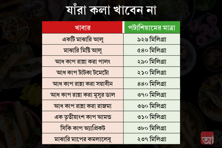 ভাবছেন, দিনে যেখানে ৪৭০০ মিলিগ্রা পটাশিয়াম খাওয়ার কথা, সেখানে একটা কলায় আর কী হবে বা কলা যাঁদের সহ্য হয় না, তাঁরা কী করবেন? চিন্তা নেই৷ আরও অনেক খাবারে হার্টের জন্য উপযোগী পটাশিয়াম আছে বেশ ভাল মাত্রায়৷ আছে ফাইবার ও ভিটামিন৷ সে সব আমরা খেয়েও থাকি৷ নীচের তালিকায় এক বার চোখ বুলিয়ে নিন৷