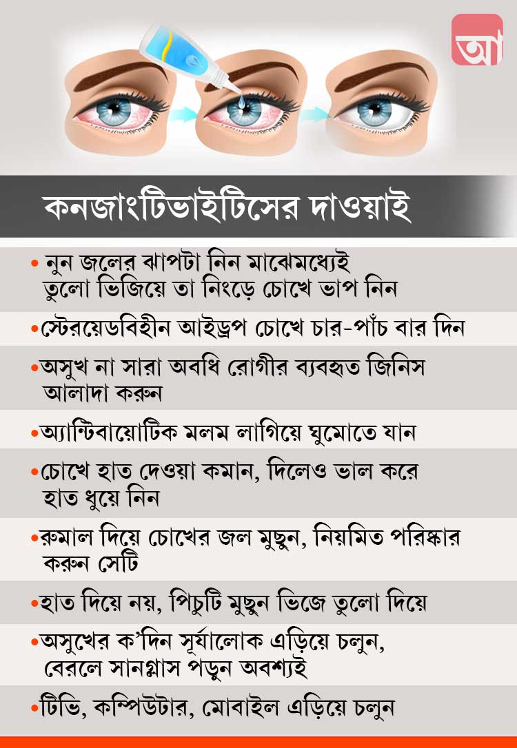 মাঝে মাঝেই গরম জলে তুলো ভিজিয়ে জল নিংড়ে সেই গরম তুলোর ভাপ নিন চোখে। দিনে চার-পাঁচ বার জলে সামান্য নুন ফেলে চোখে ঝাপটা দিন। হাত দিয়ে পিচুটি সরাবেন না, বরং কোনও তুলো গরম জলে ভিজিয়ে তা দিয়ে পরিষ্কার করুন চোখ। রোগ সেরে না যাওয়া অবধি রোগীর ব্যবহৃত তোয়ালে, রুমাল, বালিশ আলাদা করুন। সূর্যালোকে না বেরনোই শ্রেয়, একান্ত বেরতেই হলে চোখে সানগ্লাস রাখতে হবে। টিভি দেখা, কম্পিউটার বা মোবাইল ব্যবহার করবেন না। কোনও জরুরি কাজ থাকলে চোখে সানগ্লাস পরে করতে হবে সে সব কাজ। দিনে চার-পাঁচ বার অ্যান্টিবায়োটিক আইড্রপ দিতে হবে। রাতে অ্যান্টিবায়োটিক মলম ব্যবহার করুন। ঘুমনোর আগে অ্যান্টিবায়োটিক মলম লাগিয়ে রাখলে চোখ আঠালো হয়ে জুড়ে যাবে না। চোখে হাত দিলে হাত ভাল করে পরিষ্কার করুন। স্টেরয়েড দেওয়া আইড্রপ সাময়িক আরাম দিলেও একেবারেই তা ব্যবহার করা যাবে না। চোখে অ্যালার্জির সমস্যা থাকলে কনজাংটিভাইটিস হলেই চিকিৎসকের পরামর্শ নিতে হবে। তখন কিন্তু স্রেফ সুরক্ষা আর আইড্রপে তা ভাল হওয়ার নয়।