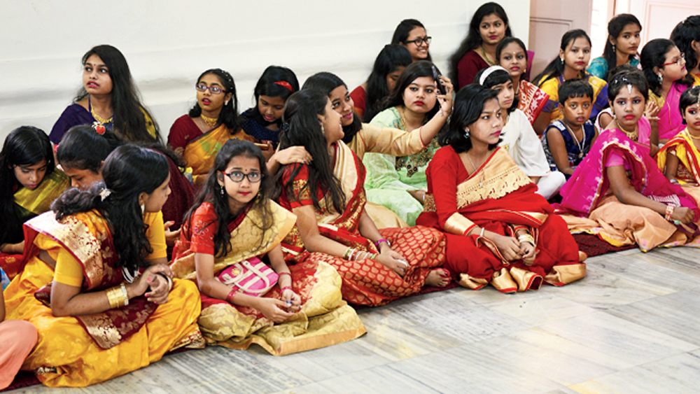 বললে কি খুব ভুল হবে? তিন-চার বছরে পা দেওয়া খুদে শিশুকন্যাকে মা যখন বাসন্তী রঙা কাপড়ে জড়িয়ে দেন, তখন থেকেই যেন বাঙালি ঘরের অসংখ্য সরস্বতীর সাজ নির্ধারিত হয়ে যায়। তার পরে স্কুলের সরস্বতী পুজোর হাত ধরে একটু একটু করে বড় হতে হতে আসে মায়ের গন্ধ মাখা বারো হাতের সেই জাদু, সবে সাজগোজ করতে শেখা সলাজ চাহনি, আর হাসি মুখে পুজোর জন্য স্কুলে গিয়ে খাটাখাটনি। আগের দিন থেকেই।