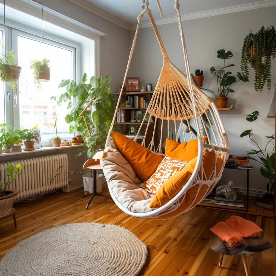 হ্যামক চেয়ার: পুরো হ্যামক ঝোলানোর জায়গা না থাকলে এটি বেছে নিতে পারেন। সিলিং থেকে একটি মাত্র হুক দিয়েই এটি ঝোলানো যায় এবং দেখতেও খুব আধুনিক।