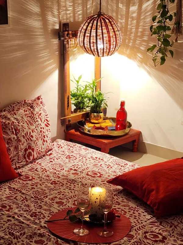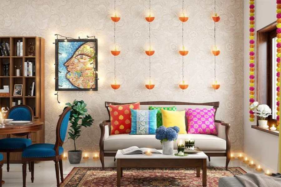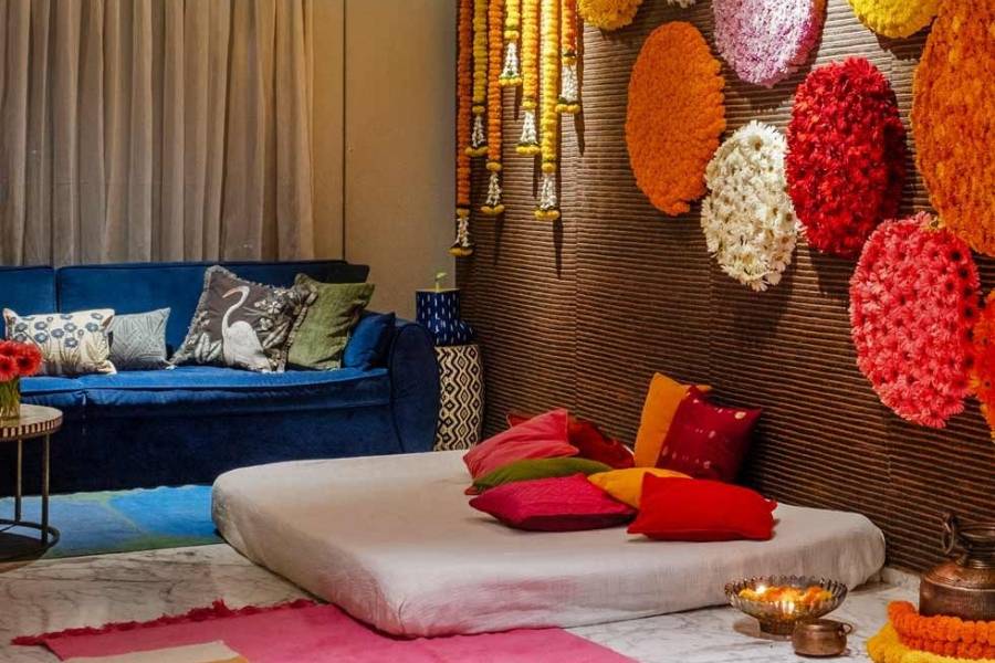 ঘরে বসার ব্যবস্থা বাড়িয়ে নিতে হলে মাটিতে ম্যাট্রেস পেতে তার উপরে ছড়িয়ে রাখতে পারেন রঙিন কুশন। সঙ্গে দেওয়ালে রঙিন ফুলের ওয়াল হ্যাঙ্গিং বা লম্বা করে মালা ঝুলিয়ে দিলে দেখতে ভাল লাগবে।