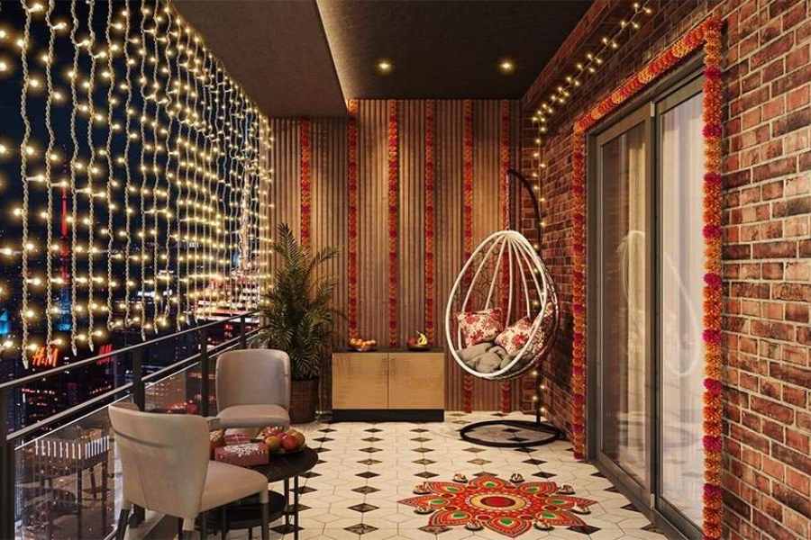 অতিথিদের বসানোর জন্য সাজিয়ে তুলতে পারেন বারান্দাটিও। মিনিয়েচার স্ট্রিং লাইট ঝুলিয়ে দিন। তার সঙ্গে রঙিন কাগজে নকশা করে সুতোয় আটকে ঝুলিয়ে দিন দেওয়ালে। বাহারি গাছ আর রঙিন কার্পেট পেতে দিলেই দেখতে সুন্দর লাগবে বারান্দা।