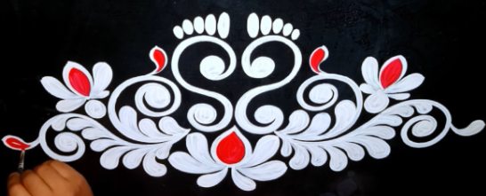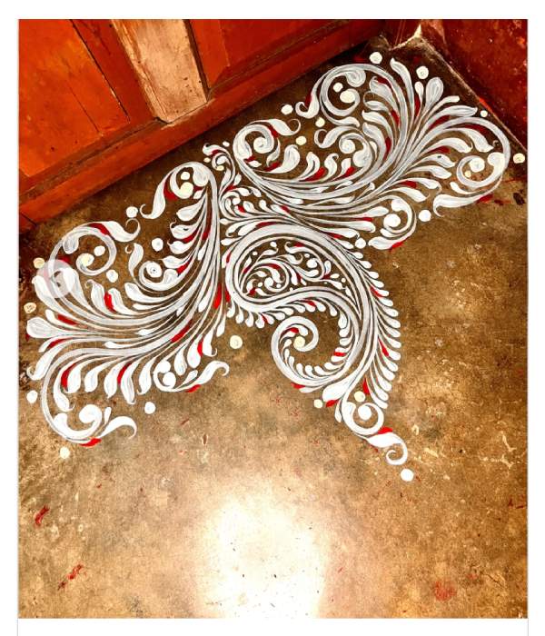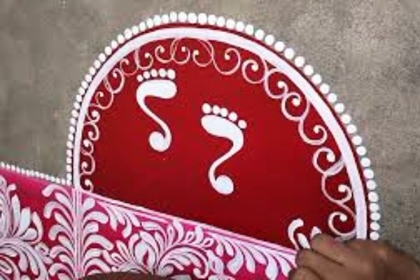 আলপনার নানা রকমের নকশা হয়। কলকা, ফুল, পাতা। চিরকালীন সেই নকশায় সাদার পাশে ভরে দিন সামান্য ‘শুভ’ লাল রং। তবে তা আরও উজ্জ্বল হয়ে উঠবে।