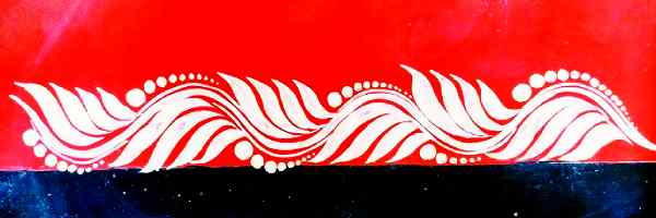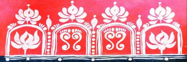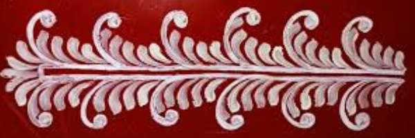 আলপনায় আরও একটি নকশা নেওয়া যেতে পারে পুজোর উপাচার থেকেই। সেটি হল আমপাতা। সরু লম্বাটে আম্রপল্লবের পাঁচ-পাতা ঘটে স্থাপন করে তবে পুজো এগোয়।