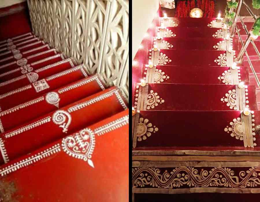 চৌকাঠ, পুজোর ঘরের মতো আলপনা দিয়ে সাজানো যেতে পারে সিঁড়িও। সরু নকশা দিয়ে বর্ডার দিয়ে দিন অথবা দু’ পাশে এঁকে দিন পছন্দের নকশা।