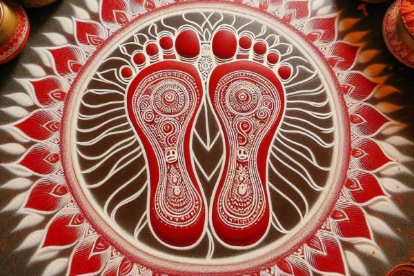 লক্ষ্মীপুজোর আলপনা যে নকশা ছাড়া অপূর্ণ, তা হল লক্ষ্মীর পা। লক্ষ্মী পায়ে পায়ে আসনে এসে থিতু হয়ে বসছেন, এটি বোঝাতেই ওই আলপনার উদ্ভব। তবে তার নকশা এমনই যে, তা আলপনাতেও আঁকা যায়।