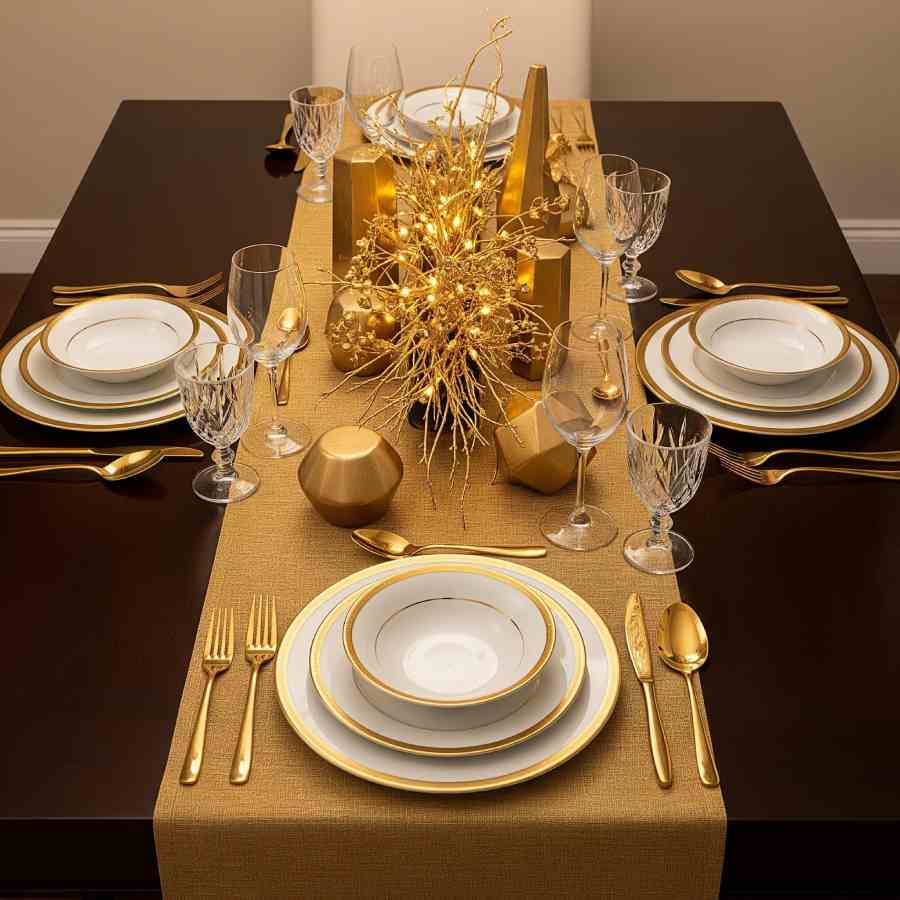 পার্টি হলে তার প্রধান আকর্ষণ খাওয়ার টেবিলেই। আবার বাড়ির সব সদস্য একজোট হনও খাওয়ার টেবিলে। তাই সোনালি ছোঁয়া সেখানেও রাখা উচিত। পার্টি হলে গোল্ডেন রিম বা সোনালি বর্ডার দেওয়া ডিনার সেট ব্যবহার করুন। যদি তা না থাকে, তবে সাধারণ সাদা প্লেটের সঙ্গে সোনালি নকশা করা ন্যাপকিন বা সোনালি রঙের চামচ-কাঁটা ব্যবহার করতে পারেন। এ ছাড়া, ডাইনিং টেবিলের মাঝখানে একটি সোনালি ফুলদানিতে কিছু ইনডোর প্ল্যান্ট বা শুকনো ফুল সাজিয়ে রাখতে পারেন। টেবিল ক্লথের উপরে সোনালি রঙের নেট বা সিল্কের রানার ব্যবহার করে তার উপর খাবারের পাত্র সাজিয়ে দিলে তা-ও দেখাবে রাজকীয়। বর্ষশেষের সপ্তাহে কোনও একটা দিন শুধুমাত্র বাড়ির সদস্যদের নিয়ে বিশেষ ভাবে টেবিল সাজিয়ে নৈশাহার করাই যেতে পারে।