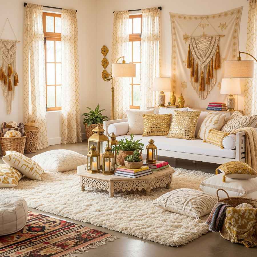 ঘরের ভোল বদলে দিতে কাপড়ের জুড়ি নেই। বিশেষ কোনও একটি রংকে প্রাধান্য দিতে চাইলে সেই রঙের কাপড় কুশনে, চাদরে, পর্দায় ব্যবহার করলেই বিনা আয়াসে নজর কাড়া যায়। উৎসবে সেনালি রঙে ঘর সাজাতে চাইলে বিছানায়, বসার জায়গায় সোনালি সিক্যুইনের কাজ করা কুশন কভার ব্যবহার করতে পারেন। যে পর্দা ঘরে টাঙিয়েছেন, তার মাঝখানে সোনালি রঙের একটি করে পর্দা ঝুলিয়ে দিন। অথবা সোনালি চওড়া ফিতে দিয়ে বেঁধে রাখুন পর্দার কিছুটা অংশ।