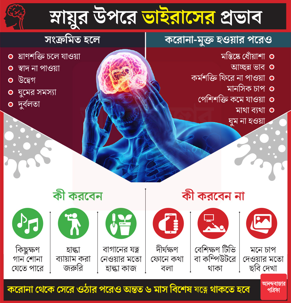 এই ভাইরাস যে ফুসফুসের পাশাপাশি মস্তিষ্কের ক্ষতিও করছে যথেষ্ট, তা বুঝতে সময় লেগেছে অনেকের। তবে এখন বহু ক্ষেত্রে দেখা যাচ্ছে, করোনা ছেড়ে গেলেও মস্তিষ্কে ধোঁয়াশার মতো কিছু সমস্যা বেশ প্রকট হয়ে উঠছে বলে জানাচ্ছেন মনোরোগ চিকিৎসক জয়রঞ্জন রাম। তিনি বলেন, ‘‘ধোঁয়াশার পাশাপাশি, উদ্বেগ, টানা মাথা ঝিমঝিম করার মতো অসুবিধাও অনেকের হচ্ছে। মানসিক ক্লান্তিও লক্ষ্য করা যাচ্ছে বহু করোনা থেকে সেরে ওঠা মানুষের মধ্যে।’’ আর থাকছে যখন-তখন মাথা ব্যথা, ঘুম না হওয়ার মতো সমস্যা।