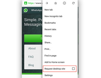 ২। মোবাইল ব্রাউজার আপনাকে হোয়াটসঅ্যাপের হোম পেজে নিয়ে যাবে। এ বার ব্রাউজার অপশন থেকে ‘রিকোয়েস্ট ডেস্কটপ সাইট’ বেছে নিন। এখান থেকেই পেয়ে যাবেন প্রয়োজনীয় কিউআর(QR) কোড।