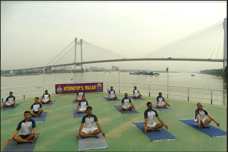এই রাজ্যেও পালিত হল যোগ দিবস। আইএনএস নেতাজি সুভাষে চলছে প্রাণায়াম। ছবি: নিজস্ব।