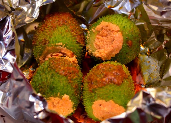 ফয়েল খুলতেই বেরিয়ে এল কাঁকরোল। চামচ দিয়ে কেটে মুখে পুরতেই এক অসাধারণ স্বাদ। টক ঝাল মিষ্টি ক্রিমি পুর। গরম ভাত দিয়ে দিব্য লাগবে নতুন স্বাদের এই ডিশ।